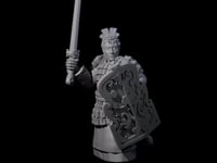 Ancient guardian rises with ornate shield and blade to defend sacred halls.
