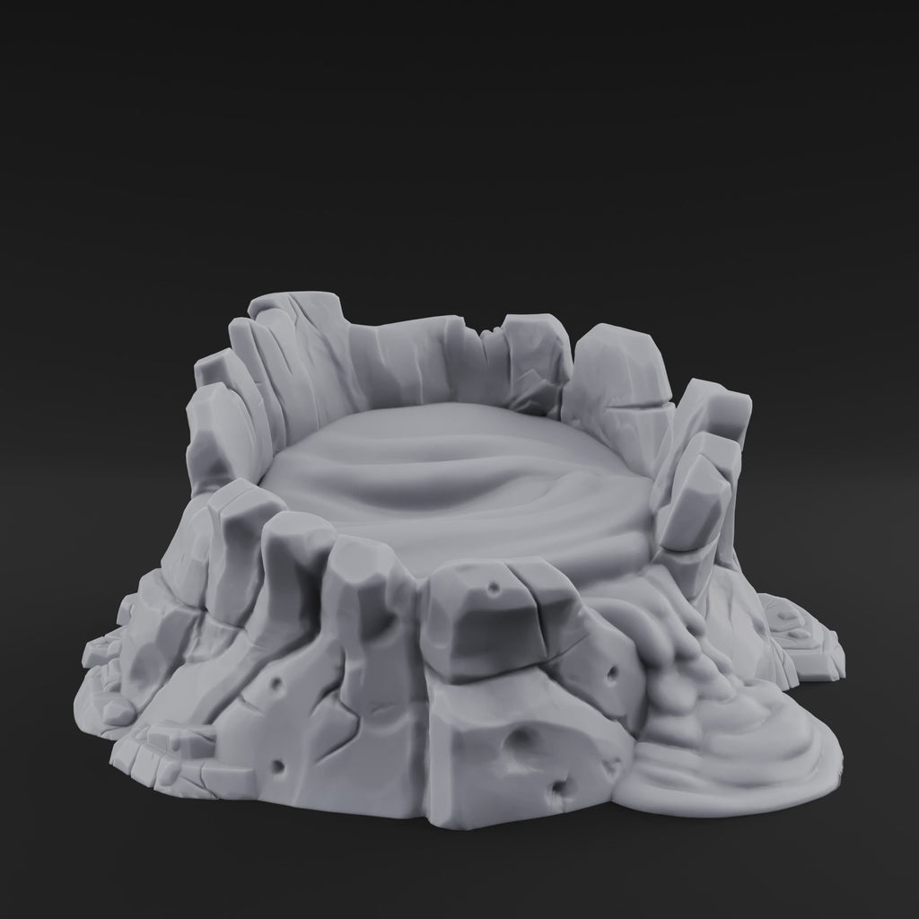 As a scatter piece, this crater punches well above its weight. Use it as a volcanic vent leaking toxic fumes, an elemental summoning site, or a hazardous objective marker that forces players to weigh risk against reward. In skirmish games and wargaming, the raised stone lip provides light cover while the open basin creates a dangerous no-man's-land — hold the crater or give it a wide berth. For RPG encounters in D&D, Pathfinder, or Forbidden Lands, it transforms any table into the slopes of a restless volcano, perfect for dragon lairs, fire giant territories, or planar rifts bleeding into the material world. Printed in high-detail resin at 28mm scale, every crevice catches a wash beautifully.