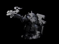 Unleash the fury of the Demon Gun Firing Dwarf, a masterfully crafted miniature that captures the essence of a hardened dwarf warrior. With a fierce expression and a robust build, this figure commands attention on the battlefield. The intricately detailed armor, complete with segmented plates and ornate embellishments, enhances the dwarf's imposing presence. The dwarf's right hand grips a fantastical firearm, discharging a swirling plume of smoke, while his left hand wields a massive spade-like weapon, ready for action. His long, thick beard and demonic head adornments add a rugged, otherworldly touch to this captivating character.