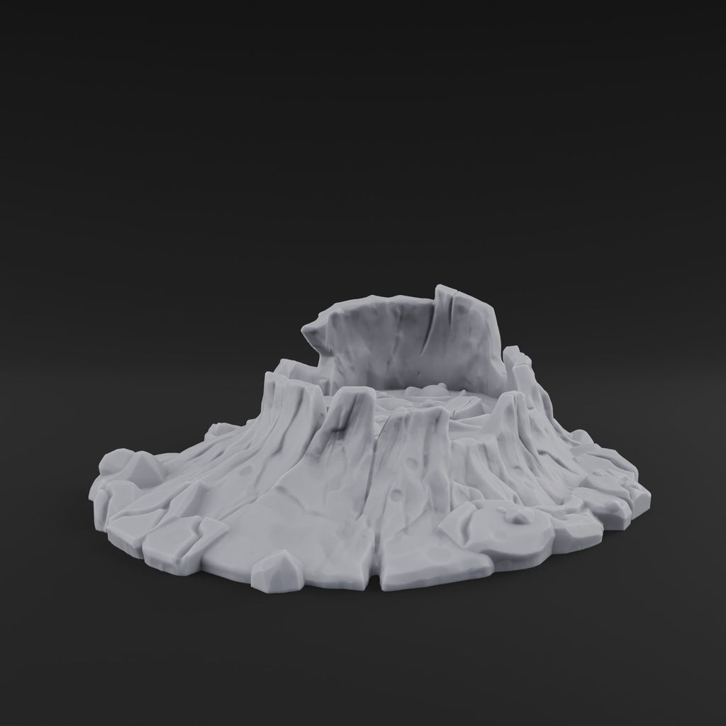 Jagged rock walls split and buckle around a hollowed-out crater, the sculpted surface alive with the texture of cooled magma flows and fractured stone. At just 5.0 × 5.9 cm across and 1.7 cm tall, this miniature volcano commands attention without overwhelming the board — its broken rim and scattered rubble base giving it a raw, geological weight that feels earned. 3D printed in high-detail resin, every fissure and flow line is crisp and ready for your paintbrush.