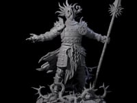 This imposing figure strikes a commanding stance, wielding a spear with practiced authority while extending its free arm in a gesture of power. The miniature showcases intricate details in its segmented armor, featuring distinctive square plates and an ornately decorated belt. A dramatic cloak flows from the waist, while multiple horn-like protrusions crown its partially obscured visage. The circular base presents sculpted, curling tendrils that spiral around the Myrmidon's feet, creating a dynamic foundation for this exceptional elemental warrior.