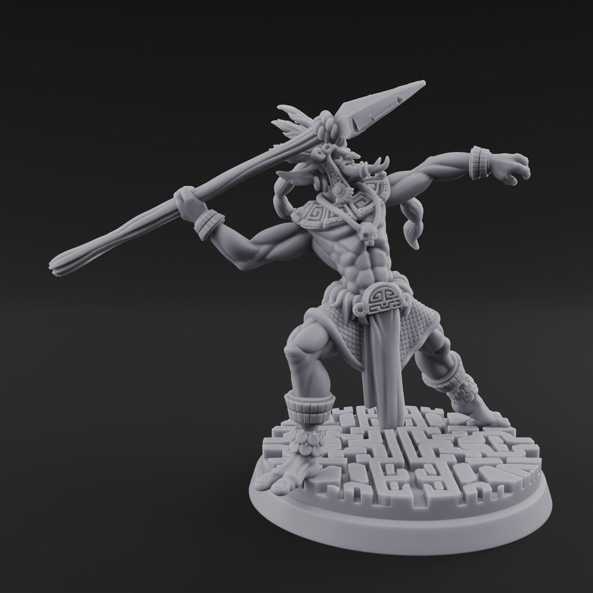 Coiled to strike, this Aztec-inspired hobgoblin warrior draws back a massive spear with explosive force, every sinew tensed for a devastating throw. Ornate glyphed armor bands, a feathered ceremonial headdress, and a woven war-skirt rich with geometric patterns mark him as a temple guardian of fearsome rank. The sculpt captures razor-sharp detail across every carved amulet, knotted muscle, and ceremonial anklet, delivering an imposing tabletop presence that demands attention from across the room.