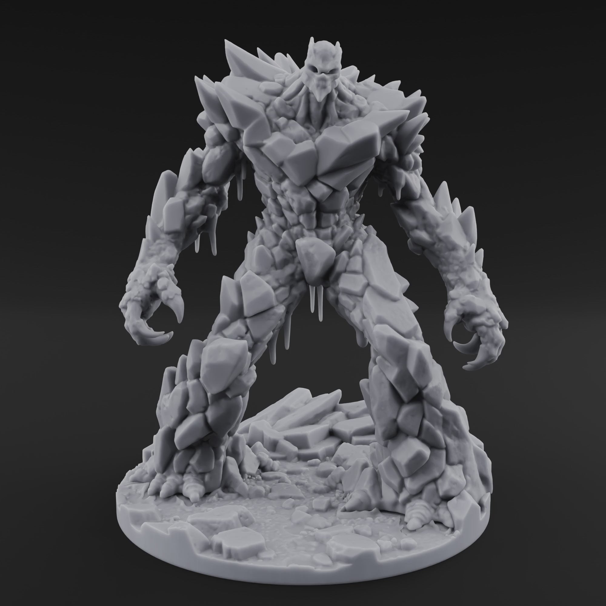 Fractal is raw elemental fury given form. Massive slabs of fractured stone interlock across its hulking frame, icicle-like mineral deposits dripping from its joints and torso as if the creature just tore itself free from deep beneath the earth. Wicked stone claws curl from arms thick as pillars, and a menacing face glares out from a crown of jagged crystalline spikes. The sculpt's imposing tabletop presence is undeniable — every fissure, every shard, every crumbling edge is rendered with stunning clarity in hand-poured resin.