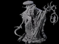 This detailed miniature captures the Krampus in an authoritative stance, one arm raised in command while the other grips an intricately designed staff bearing a suspended ritual object. Multiple horns crown its head beneath a distinctive wide, flat headpiece, while layers of textured robes cascade down its form. The figure's back and shoulders feature elaborate detailing, enhancing its mythological gravitas. Set upon an organic, uneven terrain base, this piece offers painters and collectors a spectacular centerpiece for winter-themed encounters or display.