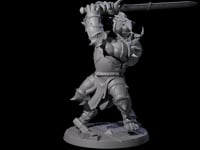 The Ironkeep Troll D miniature is a remarkable representation of a classic fantasy adversary, perfect for enhancing your tabletop gameplay experience. Standing on a 50mm base, this miniature captures the raw power and intimidation of a troll warrior. Its large, muscular build is complemented by grotesque features, including a wide mouth with pronounced tusks and sharp teeth, all of which are designed to evoke fear and awe. The troll's dynamic pose, with its feet firmly planted on a rocky terrain, suggests a readiness for battle, while the sword raised high above its head indicates its intent to strike with formidable force.