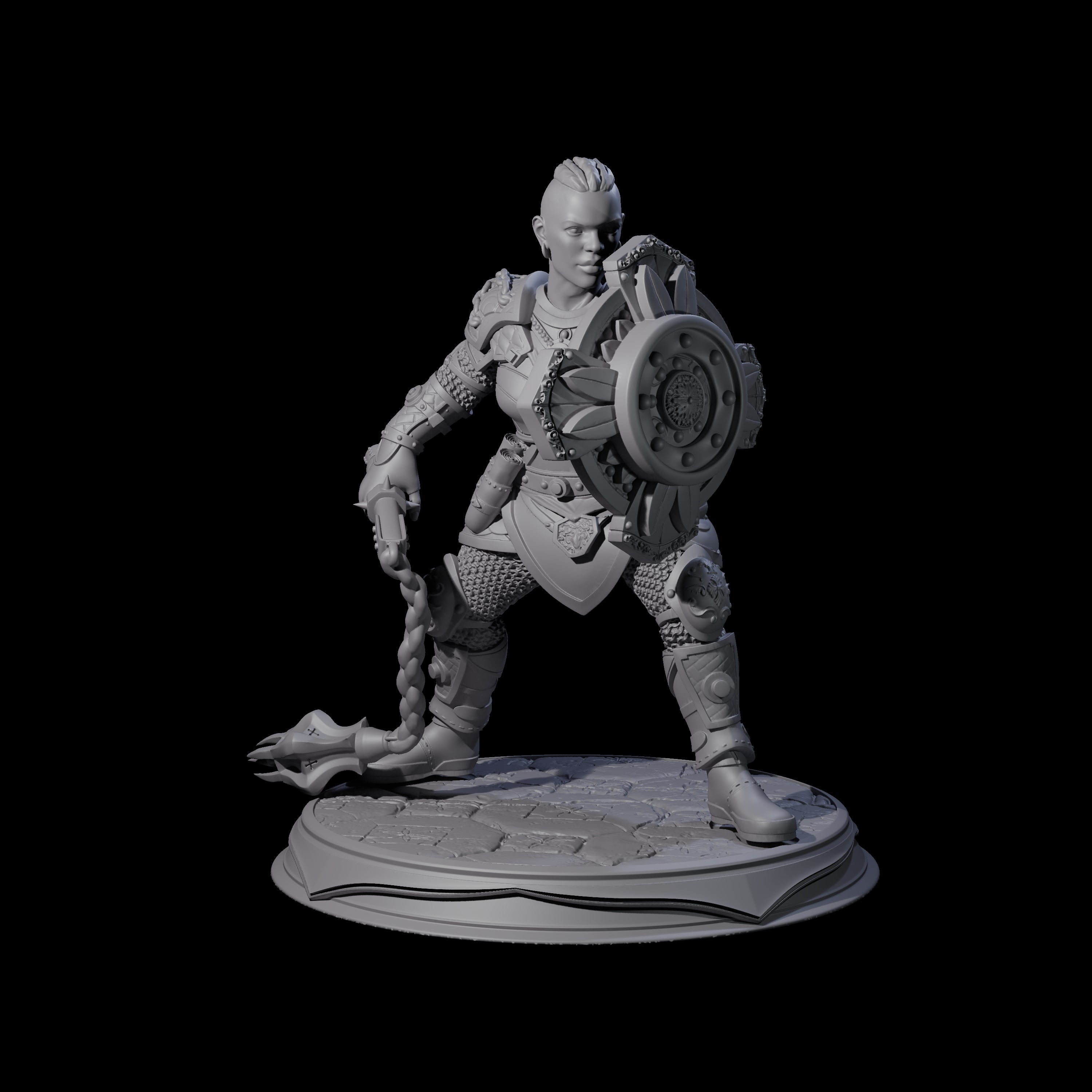 Her intricately braided hair and fierce expression reflect her warrior heritage, while her armor’s fine detail and adornments highlight the artistry of dwarven craftsmanship. Every inch of this miniature tells a story—from the runes engraved on her shield to the reinforced chain weapon wrapped in her grip, symbolizing the dwarves’ legacy of blending tradition with combat innovation.