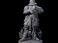 The Resting Black Iron Inquisitor is more than just a figure; it tells a story of justice and fortitude. The inquisitor's belt is laden with pouches and scrolls, hinting at the character's investigative nature and formidable expertise in uncovering secrets. A hammer hangs from the belt, symbolizing not just a preference for melee combat but also serving as a representation of judgment and execution. Stylized flames rise at the inquisitor's feet, enhancing the dramatic presence and suggesting a character who embodies both wisdom and power.
