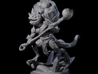 This detailed Troglodyte humanoid miniature captures the essence of subterranean mysticism. The figure's hunched, forward-leaning posture and lizard-like features are masterfully sculpted, from its pronounced facial details to its clawed limbs and signature tail. Adorned with minimal ceremonial wraps and belts, the cultist clutches a staff crowned with a spherical focus. The round base features intricate crystal and rock formations, providing environmental context for this cave-dwelling mystic.