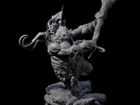 In the lore of fantasy realms, the Spiky Hill Giant Matron commands respect and fear among her kin and foes alike. Her minimalistic attire, crafted from tattered, natural materials, speaks to her connection with the wild and untamed world she inhabits. The intricate designs of her club echo this theme, with twisted organic patterns that highlight her mastery of the natural elements. Her fierce, determined expression, framed by wild, unkempt hair adorned with spikes, tells a story of a giantess who has seen countless battles and stands as a pivotal figure in the hierarchy of fantasy giantdom.