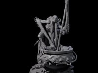The Spindly Forest Hag B tells the story of a dark and ancient being, known to inhabit deep, enchanted woods where it brews potent spells in its ornate cauldron. The rocky, forest-like base is adorned with details such as twisted roots and creeping vines, suggesting a connection to the earth and its primal magic. Stirring its cauldron with a long staff, this hag is a master of dark, forest magic, drawing upon ancient powers to influence the world around it. This figure invites players to imagine its backstory and motivations, enriching any tabletop campaign.