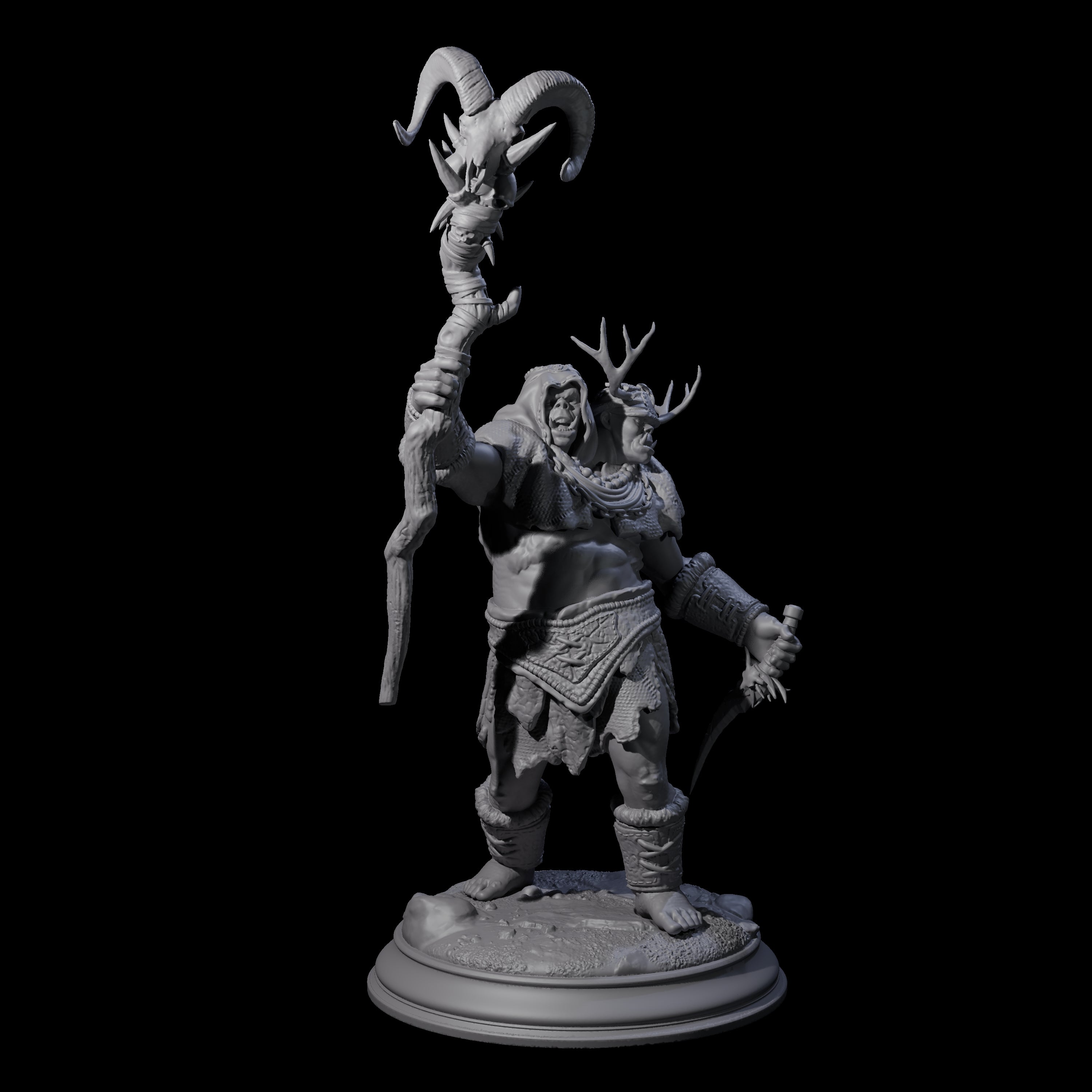The Magi Ettin stands as a rare and unsettling blend of brawn and twisted sorcery, a creature born from both brute force and dark magic. With one head cloaked and crowned with ominous antlers, and the other peering out from under a sinister hood, this two-headed shamanic giant wields a staff topped with a twisted ram skull. Enshrouded in primal garments and decorated with crude totems, this unique Ettin feels deeply at home in forbidden forests or cursed ruins, ready to unleash magical chaos upon unsuspecting adventurers in Dungeons & Dragons, Pathfinder, or other tabletop RPG encounters.