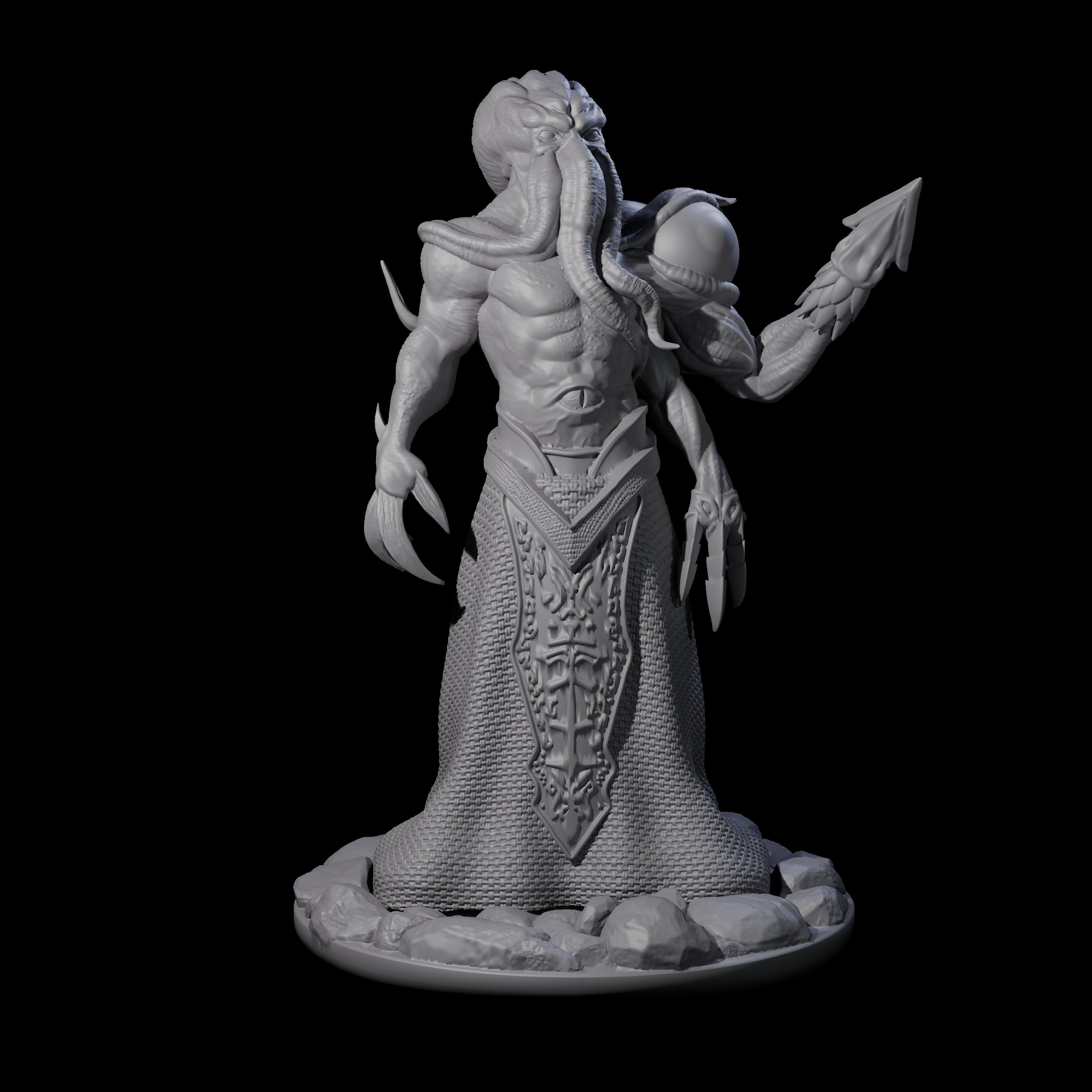 Embrace the horror and intellect of this Towering Elder Brain-Infected Mind Flayer on your tabletop, an imposing figure with immense potential for fearsome D&D, Pathfinder, and Call of Cthulhu campaigns. This disturbing blend of mind flayer and elder brain infection manifests as a towering creature whose tentacles weave around an ominous brain-like eye, gleaming with dark intelligence and twisted purpose. With intricate robes etched in forbidden symbols, this creature embodies the corruption and sinister allure of an elder brain's influence.
