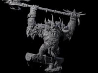 This imposing Beast miniature captures the raw power of a Giant Ape in mid-strike, muscles tensed as it raises a massive double-headed axe overhead. The detailed sculpt features rugged, fur-lined armor adorned with skull decorations and layered shoulder guards. Its fierce expression, complete with pronounced fangs and an open, roaring mouth, exemplifies its savage nature. The dynamic pose, with one leg raised atop the textured rocky base, creates a commanding presence perfect for epic tabletop encounters.