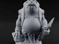 This massive walrusfolk hunter stands with his gut proudly exposed, a spear gripped in one heavy fist and a rough-hewn stone clutched in the other. Twin ivory tusks frame a bristled, scowling muzzle, while a necklace of fangs and claws drapes across his barrel chest. Fur-lined hide armor and a crude loincloth speak to a life lived far from civilization, where only the strong endure.