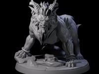 This detailed miniature captures a powerful quadrupedal sphinx in a dynamic crouching stance, showcasing its formidable physical presence. Multiple curved horns crown its snarling, fanged visage, while a wild mane flows around its head and neck. Distinctive features include pronounced spiked ridges along its back and decorative bands adorning its limbs. The circular base features carefully sculpted terrain elements, complete with rocky outcroppings and a grim skull detail that adds narrative depth to any encounter.