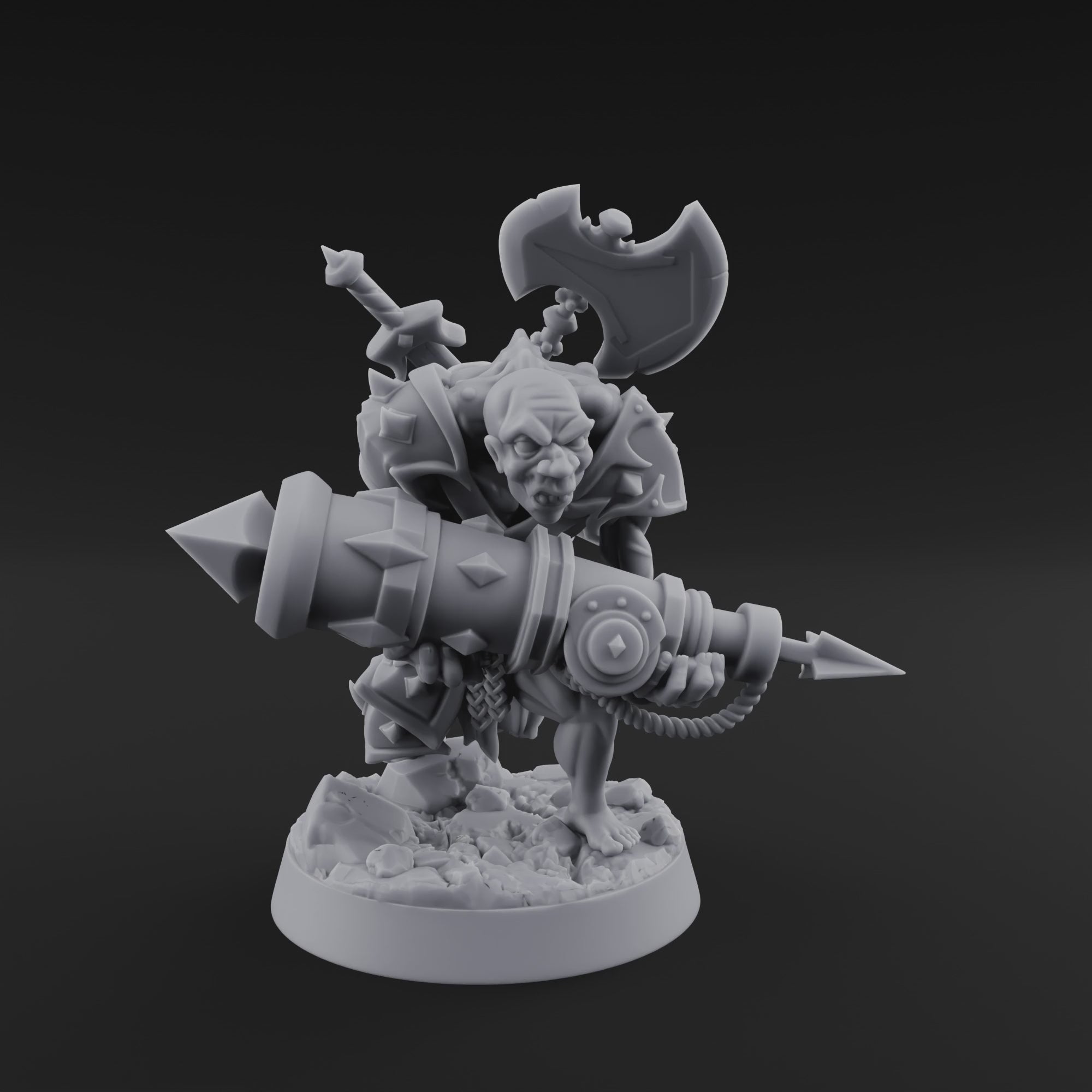 Hunched beneath a massive makeshift rocket bristling with crude iron fins and riveted plating, this disfigured acolyte charges forward with unhinged determination. A brutal battleaxe juts from the arsenal strapped to his back, and his snarling, twisted face radiates fanatical devotion — every rivet, rope, and scar rendered in razor-sharp resin detail across a dynamic rubble-strewn base.