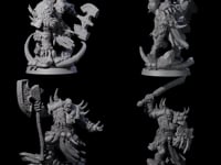 Introducing the Elite Orc Hit Squad, a captivating set of four intricately designed orc warrior miniatures, each poised for battle and ready to elevate your tabletop adventures. Model A towers with authority, brandishing a massive double-headed ax, his rugged armor adorned with spikes and fur, creating a dominating presence on the battlefield. Model B is captured in dynamic motion, his tattered garments and barbarian-like demeanor highlighted by the formidable morning star he wields, making him a fierce adversary.