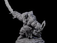 The story of this ogre is one of survival and dominance in the unforgiving realms of fantasy tabletop games. Wielding a massive, serrated sword in its right hand and a menacing cleaver-like weapon in its left, the ogre appears ready to strike fear into the hearts of adventurers. Its deep-set eyes and snarling mouth full of sharp teeth communicate its aggressive nature, making it a perfect antagonist for campaigns set in the wild, chaotic lands where only the strongest survive.
