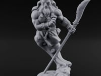Juzan emerges from swirling clouds of mystical energy, his muscular form radiating supernatural power. Twin horns crown his fierce visage while his long beard flows like desert winds. Gripping a curved scimitar with deadly grace, this djinni lord stands ready to grant wishes or unleash elemental wrath upon those who dare command him.