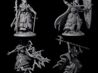 Unleash the dark allure of the underworld with our Four Decorated Skeleton Guards Miniature Set. Each of these skeletal warriors boasts unique features that bring them to life in your tabletop RPGs. Model A stands out with a tall, ornate staff and horned helmet, exuding an aura of command and magical prowess. Model B, with its decorated shield and dynamic pose, is ready to defend with valor. Model C, a mystical figure with a jagged energy-emitting staff, offers a presence that hints at necromantic powers. Lastly, Model D captivates with its martial stance and dramatic armor, perfect for swift, agile combat.