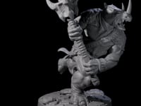 Introducing the Grim Rhinofolk Gladiator C, a striking addition to your tabletop RPG collection. This miniature stands out with its muscular, rhinoceros-like physique, capturing the essence of a relentless warrior mid-battle. The Gladiator's dynamic pose, with a left leg bent and a massive double-headed battle axe raised high, conveys a sense of power and action, ready to strike fear into any opponent. The detailed sculpting highlights the texture of its thick skin and the rippling muscles beneath, making it a visually captivating piece for any enthusiast.