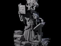 Behold the Master Tiefling Elder Wizard, a stunning representation of arcane mastery and elegance. This miniature captures the essence of a powerful Tiefling wizard engrossed in ancient studies, standing amidst an array of weathered tomes and scrolls. The wizard's posture exudes wisdom and authority, with one hand clutching a meticulously detailed spellbook and the other poised in a graceful casting gesture. Adorned in flowing robes, rich with intricate patterns, this figure embodies the high rank and vast knowledge of magical arts. The strikingly curled horns and the wizard's contemplative expression, partially shrouded by a mane of voluminous hair, enhance the figure's mystique and regality.