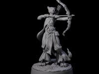 Crafted for fans of storytelling and adventure, this miniature tells the tale of a leonin huntress of noble birth. Her role as a fierce yet graceful archer is evident in the way she holds her elegantly drawn bow, ready to strike with precision and agility. The quiver and arrows on her back are a testament to her expertise and readiness for any challenge. The textured base simulates a rugged terrain, immersing her in a world of adventure and enhancing the narrative possibilities for your tabletop games.