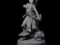 Introducing the Noble Leonin Huntress C, a meticulously crafted 25mm miniature that captures the essence of a regal feline warrior. This dynamic figure showcases the distinctive leonin features, including a flowing mane and sharp ears, which underscore her noble and fierce appearance. The huntress is depicted in a poised stance, clutching a finely crafted bow and ready to nock an arrow, embodying her specialization as an archer or ranger.