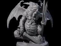 Introducing the Pertched Lizardfolk Champion, a striking miniature designed to elevate your tabletop roleplaying experience. This 50mm figure captures a dynamic crouching pose, exuding strength and authority with its robust, muscular build and textured scales. The Lizardfolk's head, crowned with impressive, curved horns and a distinct crest, adds an intimidating presence to any campaign. Its large, bat-like wings suggest a draconic lineage, hinting at the potential for flight and adding a unique twist to its reptilian heritage.