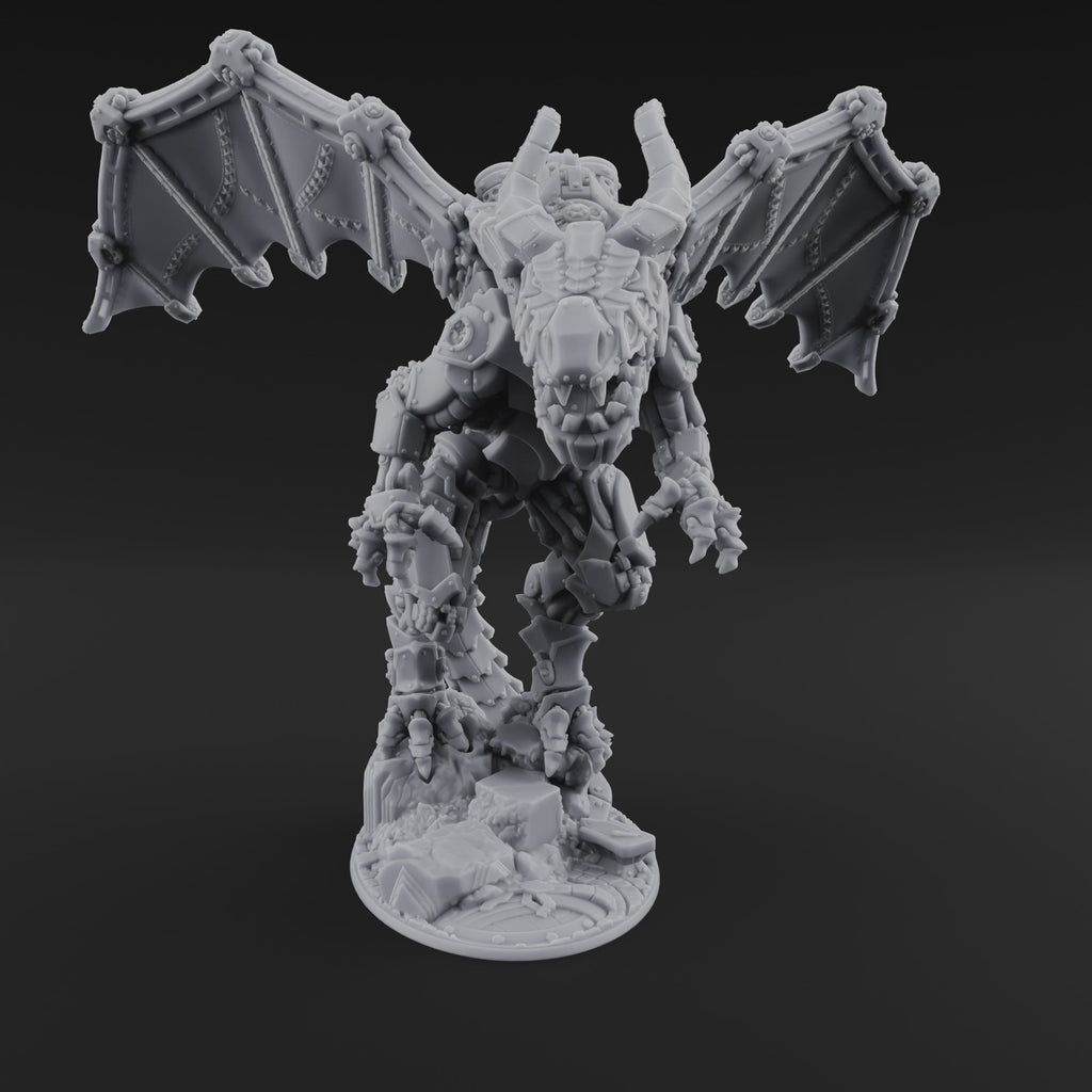 Riveted plates buckle over a draconic frame of grinding gears and superheated pipes as this colossal construct tears free from the wreckage beneath its claws. Massive iron-ribbed wings flare outward, every bolt and brace rendered in razor-sharp detail that rewards close inspection from every angle. Exhaust stacks crown its hunched back like industrial smokestacks, and its heavy-set stance radiates an imposing tabletop presence that dominates any encounter.