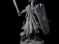 The miniature showcases intricate layered armor adorned with ornate embellishments, crowned by a crested helmet that obscures the face beneath. A tattered cloak flows from the shoulders, while the figure's pose captures a moment of martial prowess with a raised sword and tall, decorated shield. The circular base features sculpted rocky terrain, providing a strong foundation for this imposing human paladin figure. Perfect for roleplaying scenarios, character representation, or as a challenging project for miniature painters.