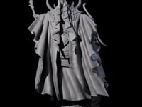The miniature features a hooded figure suspended in mid-air, their form draped in layered robes adorned with pointed embellishments. Beneath the flowing garments, segmented armor plates offer protection, while horn-like protrusions extend from the shoulders. One arm raises high, wielding an ornately curved weapon. The circular base features subtle rocky terrain, adding stability to this striking tabletop RPG character.
