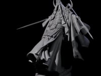 This detailed miniature captures a robed figure in a dynamic pose, with layered armor visible beneath flowing ceremonial garments. Ornate detailing adorns the chest and waist, while horn-like protrusions crown the head, marking their devotion to forbidden powers. The figure wields a thin sword with deadly precision, while the opposite hand extends outward, gripping a ritual staff. Mounted on a smooth circular base, this human miniature serves as an ideal antagonist for tabletop encounters or a striking display piece for collectors.