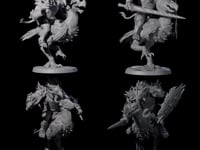 Unleash the chaos of battle with these intricately designed Four Charging Troll Riders on Axe Beaks. Each troll is uniquely crafted to capture the essence of a fearsome warrior, from Model A's robust, club-wielding figure to Model D's authoritative stance with a war hammer. The trolls are adorned in spiked armor and tattered clothing, each exuding a sense of motion and aggression as they charge forward atop their exotic axe beaks. The detailed features, from the trolls' fierce expressions to the dynamic feathers of the axe beaks, make this miniature a striking addition to any collection.