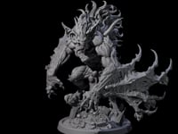 This imposing miniature captures an Oni in a predatory crouch, its muscular form dominated by twisted, branch-like protrusions erupting from its arms, back, and head. The creature's feral visage features an open, snarling mouth, while its elongated limbs end in massive, threatening claws. The circular base tells its own story through scattered ruins and broken debris, with small sculptural elements suggesting the scale of this formidable entity.
