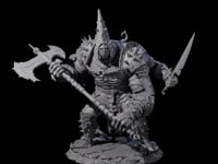 This imposing construct miniature showcases intricate detail in its spiked, jagged armor plating and distinctive helm with its narrow-slotted visor. The figure's dynamic, forward-leaning stance captures it mid-combat, brandishing both a mighty double-headed axe and sword with deadly intent. Set upon a detailed base featuring cracked terrain and scattered debris, this Helmed Horror brings an aura of inexorable threat to any tabletop encounter.