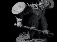 This construct miniature captures the essence of an animated suit of armor in dynamic motion. The figure's aggressive stance is accentuated by layered, jagged armor plates and menacing spikes protruding from both shoulders and helmet. Combat-ready, it wields a round shield and long weapon, while the detailed base features sculpted debris and jagged terrain that enhances the miniature's imposing presence. Perfect for encounters requiring an implacable guardian or relentless construct adversary.