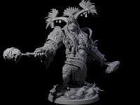 This beast miniature captures the raw power of a fur-covered warrior, featuring clawed feet and a wide, assertive stance. The figure brandishes a large, ornate staff while adorned with an impressive collection of skulls, beads, and rope accessories. A dramatic feathered headdress with curved protrusions crowns the creature, while its open-mouthed expression conveys primal intensity. The detailed base incorporates rocky terrain and organic elements, providing a sturdy foundation for this impressive tabletop centerpiece.