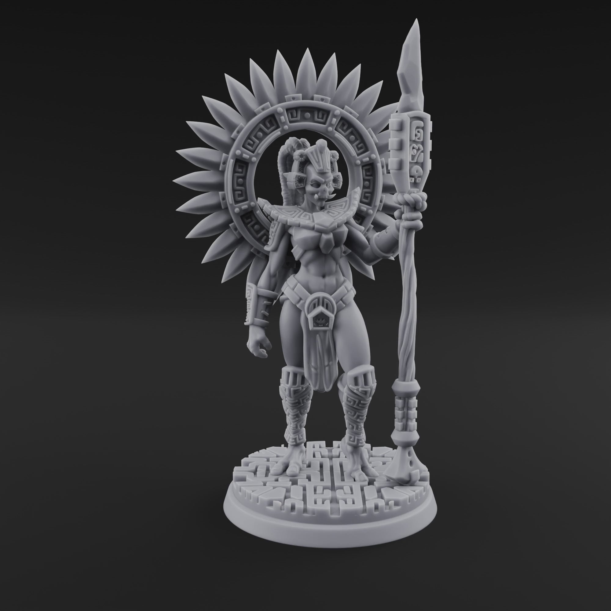 Standing in imperious authority, this hobgoblin warlord grips a rune-carved spear staff while a radiant spiked solar crown fans out behind him like a declaration of divine right. Every glyph etched into his armor, belt, and greaves carries the weight of conquered civilizations, and the sculpt's razor-sharp Mesoamerican detailing — from the ornate headdress to the inscribed temple base — delivers an imposing tabletop presence that demands attention from across the room.