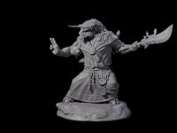 This detailed humanoid miniature captures the distinctive beast-like features of the Yakfolk race, from its distinctive hoofed feet to its fur-textured limbs. The figure's dynamic pose, with one arm raised in command, radiates authority, while its layered robes feature intricate decorative patterns. Multiple belts adorned with pouches and ornaments add depth to the sculpt, perfect for detailed painting. The round base features carefully sculpted rocky terrain, providing a stable foundation for this imposing character.