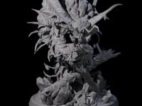 This Beast miniature showcases intricate detail, from its layered, organic plating to the numerous spiked protrusions along its segmented form. The creature's dynamic pose captures it mid-motion, with multiple clawed limbs and wing-like appendages extended in an aggressive display. Its elongated head features a menacing open mouth, while the sculpted rock formations and debris on the round base create a sense of weight and environmental context.