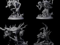 This set showcases varied manifestations of these eldritch beings: a hunched figure with spindly limbs and gaping maw, a multi-armed entity clutching its own head, an antlered specimen wielding a gnarled staff, and a quadrupedal horror with multiple heads sprouting from its spine. Each miniature features intricate texturing and dynamic poses atop detailed bases adorned with twisted roots and organic elements, perfect for creating memorable encounters or displaying your painting expertise.