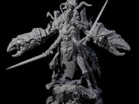 This formidable miniature captures a multi-armed warrior stance, wielding beast-headed gauntlets and longswords with lethal intent. The figure's ornate, layered armor features aggressive spikes and intricate texturing, complemented by a decorated ceremonial loincloth. A distinguished horned helm crowns the aberration, while multiple tentacle-like appendages emphasize its otherworldly nature. The detailed base, complete with chains and rubble, grounds this commanding presence in a scene of conflict.