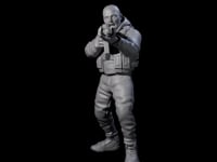 This grizzled mercenary stands in a precise firing stance, assault rifle trained on his target with deadly focus. His tactical vest and combat gear speak of countless operations across hostile territories. The weathered expression and confident posture reveal a professional who has survived by skill and cunning. Perfect for modern military campaigns or post-apocalyptic adventures.