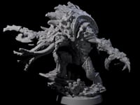 This highly detailed miniature captures the Wastrilith's imposing presence with its hunched, predatory stance and multiple lethal appendages. The creature's body combines a rugged, armored exterior with organic elements, featuring prominent spikes and ridges along its back. Multiple clawed arms and writhing tentacles emphasize its otherworldly nature, while the head bears distinctive horn-like structures with sharp, angular features. The detailed base, textured with rocky coral formations, provides an ideal staging for this fearsome fiend.