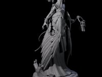 This detailed miniature captures a tall humanoid figure in ceremonial attire, featuring intricate layered robes adorned with feathered or scale-like patterns. The striking horned headdress crowns the figure's elongated form, while ornate accessories complement their ritualistic pose. Standing on a detailed base with sculpted debris and a partially buried mask, this miniature brings mystical gravitas to any tabletop scenario.