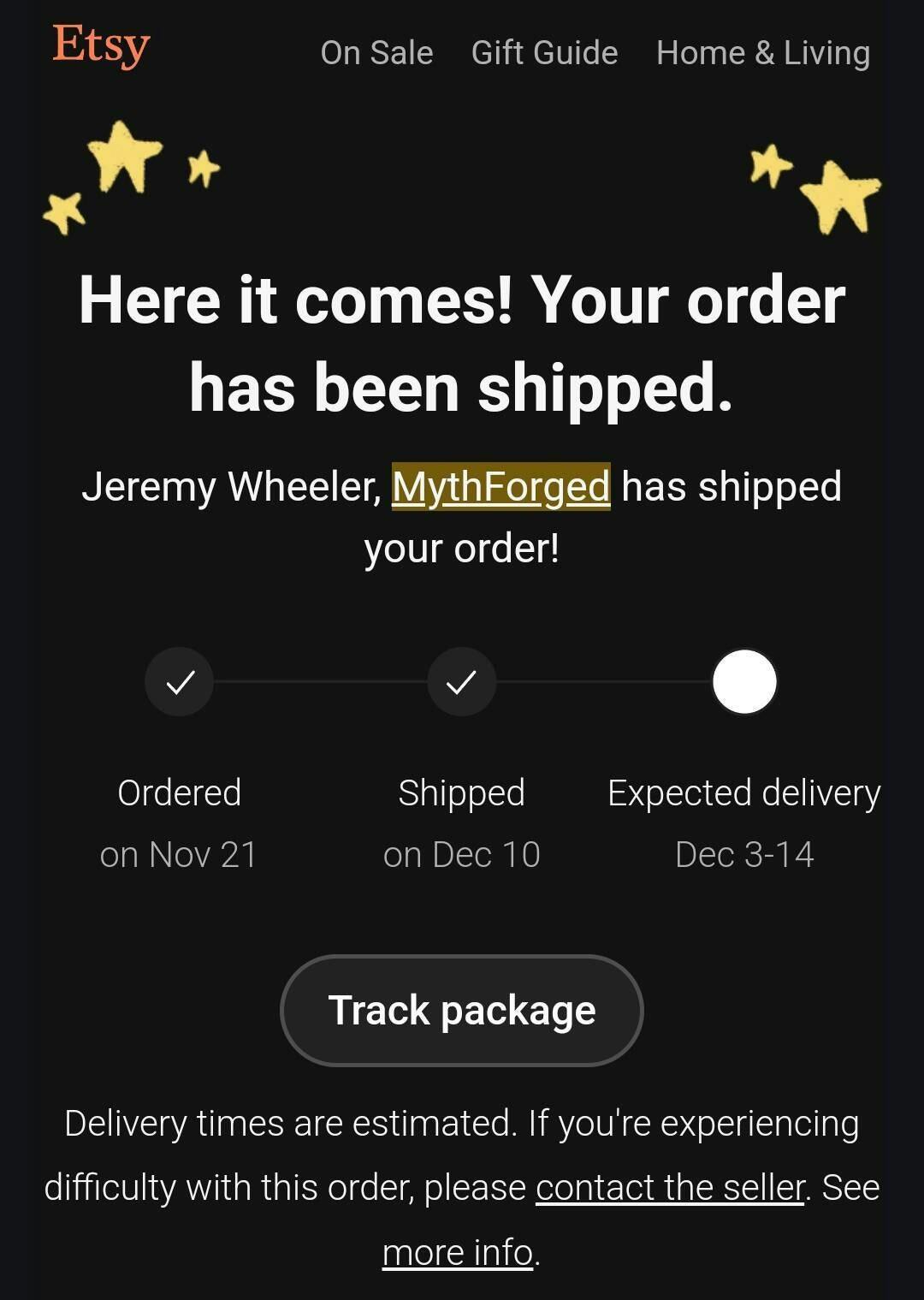 Rest assured, we are printing, cleaning up and shipping your order as fast as we can. Myth Forged is just the two of us (Sam and Steve) so sometimes in busier periods a bit of a queue can develop. Average dispatch time is 5 days but check the banner at the top of the site for accurate lead times.