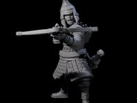 This stalwart warrior draws his crossbow with practiced precision, his face set in grim determination. Ornate lamellar armor adorned with traditional patterns speaks to his disciplined military service. His commanding stance and alert expression mark him as a seasoned veteran, ready to loose bolts at any threat to his realm.