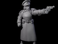 This stern Soviet officer embodies military discipline and tactical expertise. Dressed in a long greatcoat with military insignia, he extends his revolver with practiced precision while maintaining perfect posture. His peaked cap and weathered expression speak to years of battlefield command, making him ideal for alternate history campaigns where supernatural threats meet wartime grit.