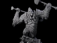 The muscular creature stands in an imposing wide stance, raising a massive war hammer overhead in both hands. Its powerful form is enhanced by heavy decorated armor featuring ornate plates and detailed embellishments. The beast's snarling visage, complete with prominent tusks, emerges from beneath the armored protection, while its fur-textured body speaks to its primal nature. The round base presents a dynamic setting with sculpted debris and broken terrain, perfect for tabletop encounters or display.
